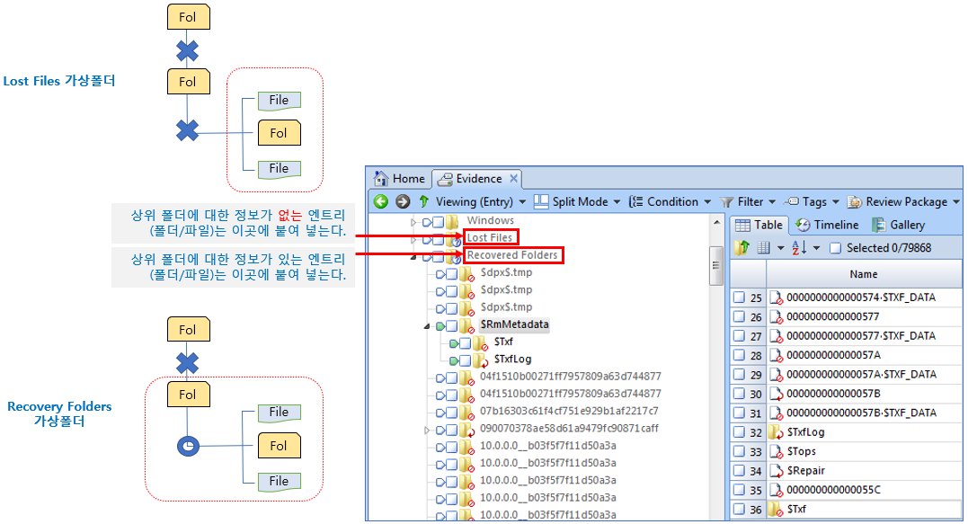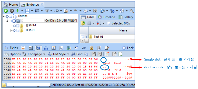 | 비할당영역과 슬랙영역 | 디렉토리 엔트리에서 .(single dot) 과 .. (double dots)을 포함하는 엔트리를 찾아서 해당 폴더와 그 아래의 파일을 복구 | $MFT 엔트리에서 ‘FILE0’ 시그너처로 찾은 다음, ‘폴더’ 표시가 있는 엔트리를 찾아서 해당 폴더와 그 아래 파일을 복구 |