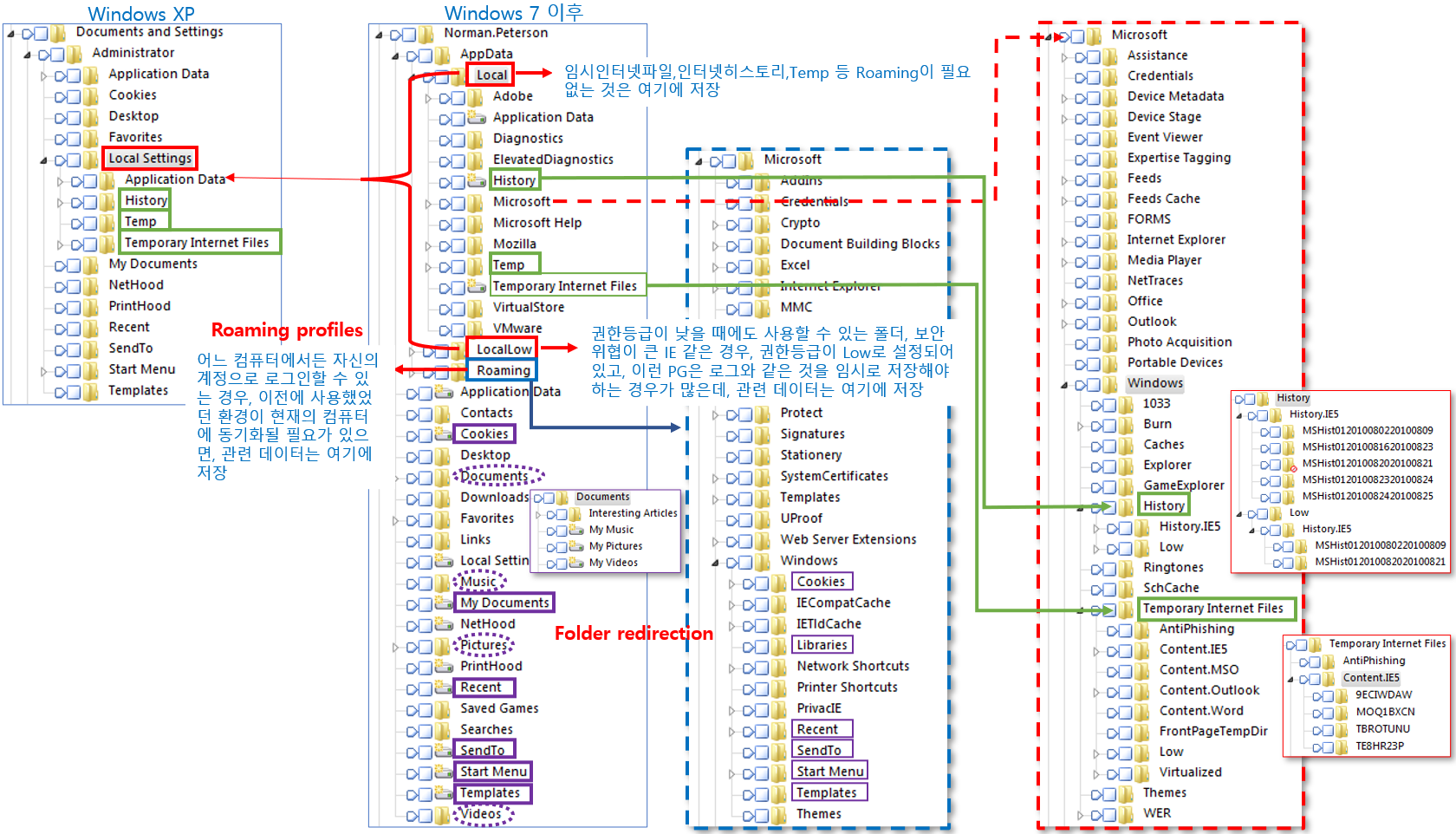 Windows 7의 폴더 구조가 Windows XP의 폴더 구조와 가장 큰 차이점은 Roaming profiles와 folder redirection 입니다.