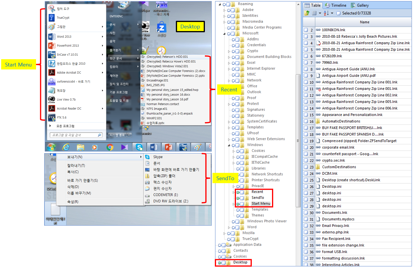 사용자의 Desktop, Recent, Start Menu, Send To 폴더에 존재하는 바로가기 형태의 파일입니다.