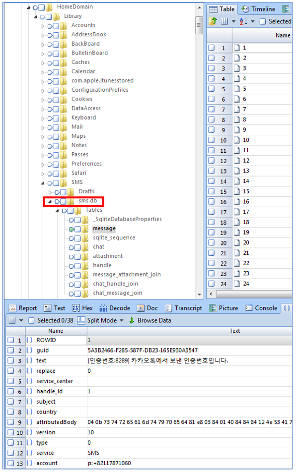 Raw Data\HomeDomain\Library\SMS\sms.db에서 파싱을 합니다.