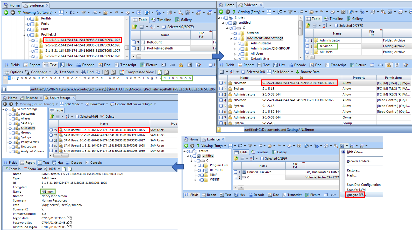 사용자 계정과 SID(Security Identifier)간의 매핑 여부를 확인해야 합니다.
