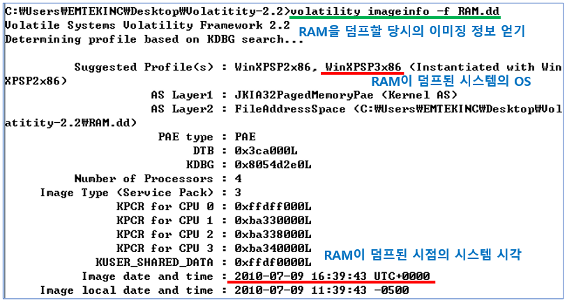 RAM을 덤프할 시점의 이미징 정보(덤프한 시스템의 운영체제, 시스템 시각 등)를 확인합니다.