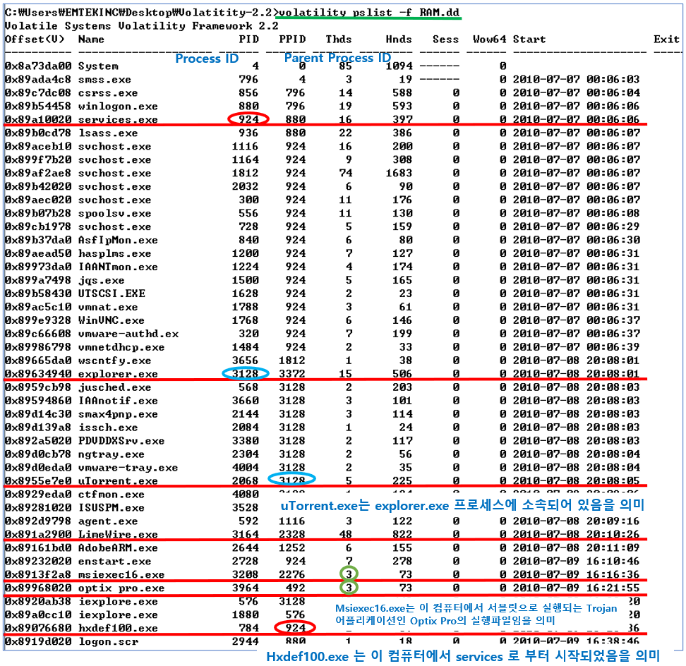 pslist 명령어를 실행하는 결과와 동일한 결과값을 보여 주지만, 좀더 알아보기 쉬운 포맷으로 보여줍니다.