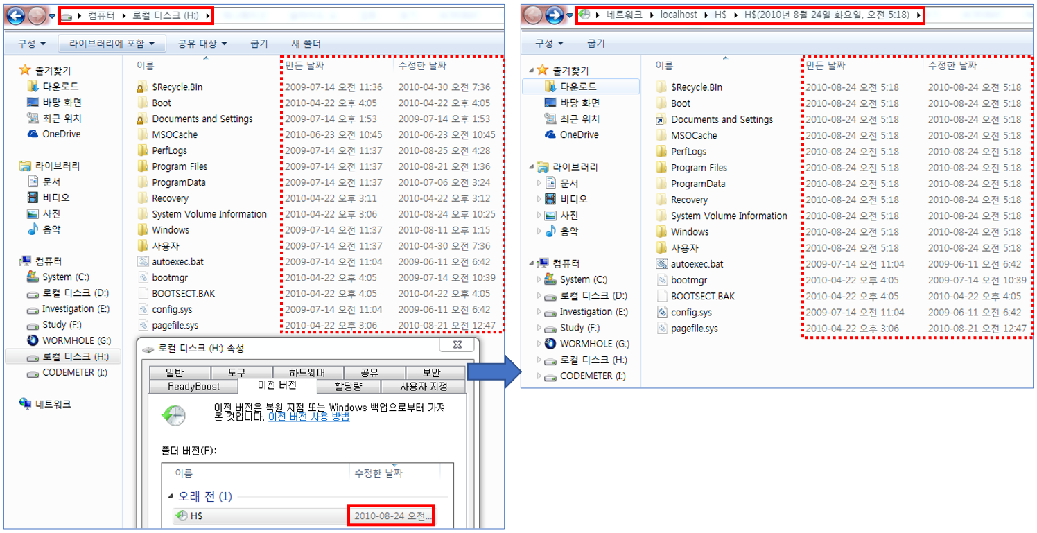 PDE를 통해 마운트된 볼륨에서 오른 마우스후 ‘이전 버전’ 메뉴 옵션을 이용하여 모든 볼륨 새도우 카피를 볼 수 있습니다.