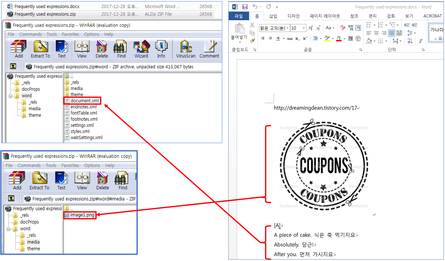 워드 문서를 ZIP 파일로 이름을 바꾸고, WinRAR에서 열어 보면 압축된 XML의 구조를 확인할 수 있습니다.