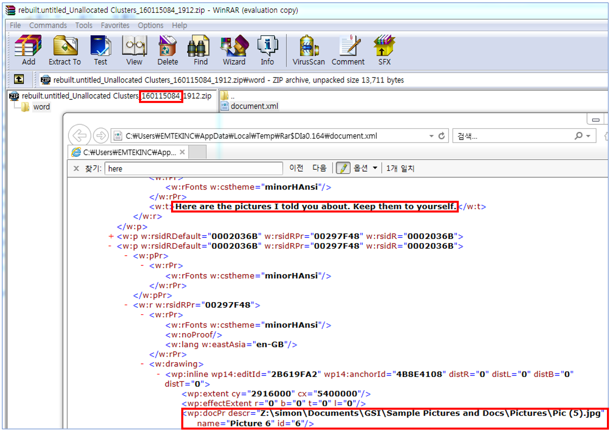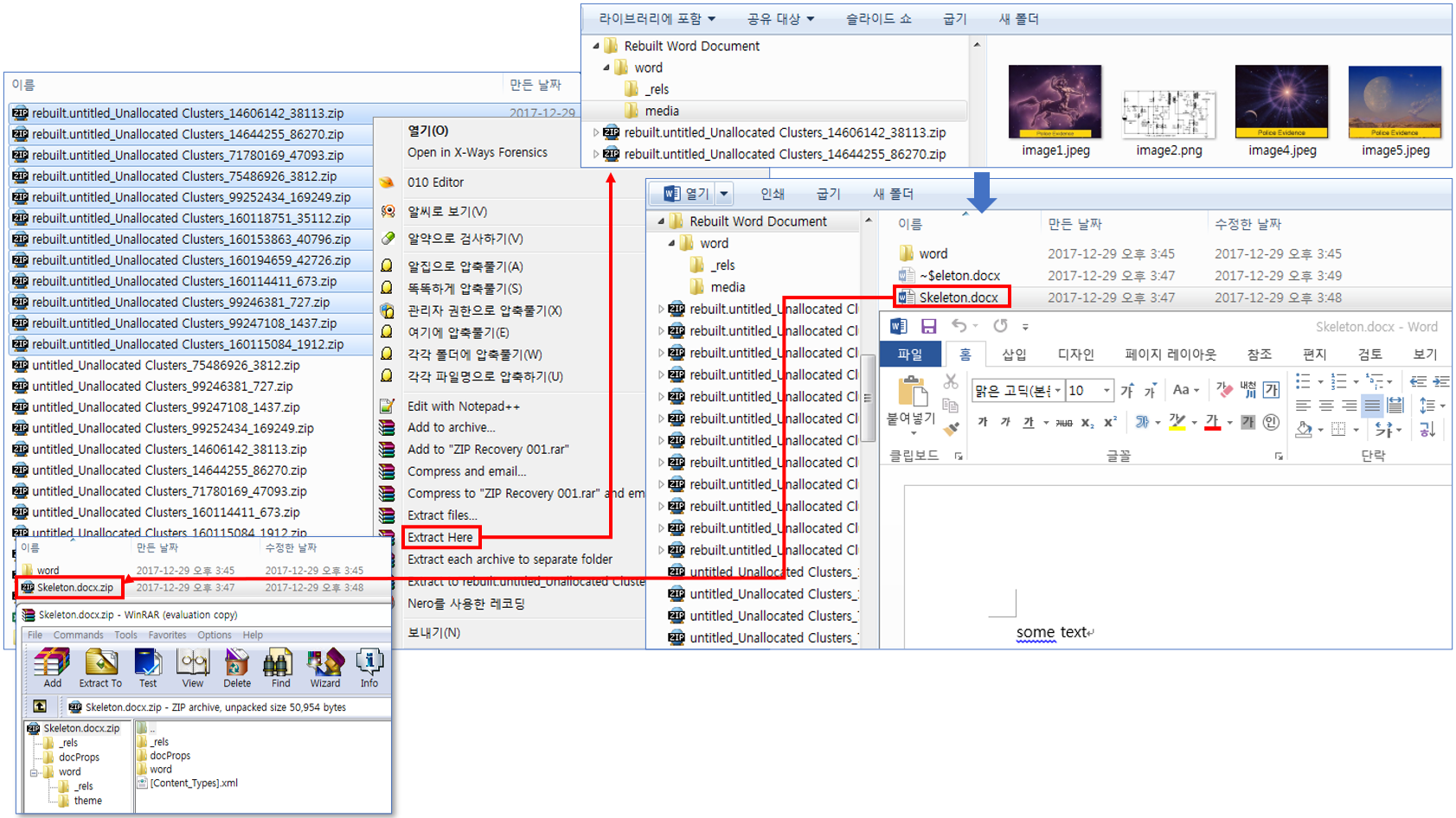 복구된 내용을 삽입할 skeleton 역할을 할 새로운 임의의 Word 문서를 하나 만들고, 확장자를 ZIP으로 바꾸어 WinRAR로 불러 들이는 방법으로 폴더 구조에 맞추어 통합시키고, 다시 Word 문서로 바꾸어 열어 보면, 이미지가 삽입된 원래의 문서파일을 복원할 수 있게 됩니다.(저는 일부만 성공했어요.ㅠ)