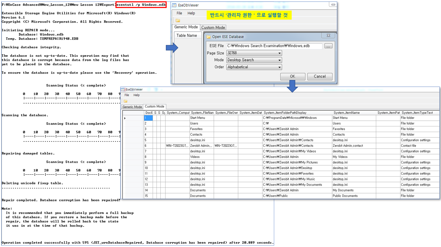 만약, 위 과정에서 에러가 발생하면 esentutl.exe 유틸리티로 손상을 치료한 후, 다시 열어 보아야 합니다.