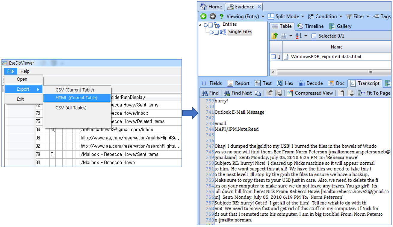 위 데이터베이스 테이블의 정보는 CSV, HTML 포맷으로 내보내기 할 수 있고, 이렇게 추출된 데이터는 다시 EnCase에 싱글파일로 추가하여 계속 분석 가능합니다.