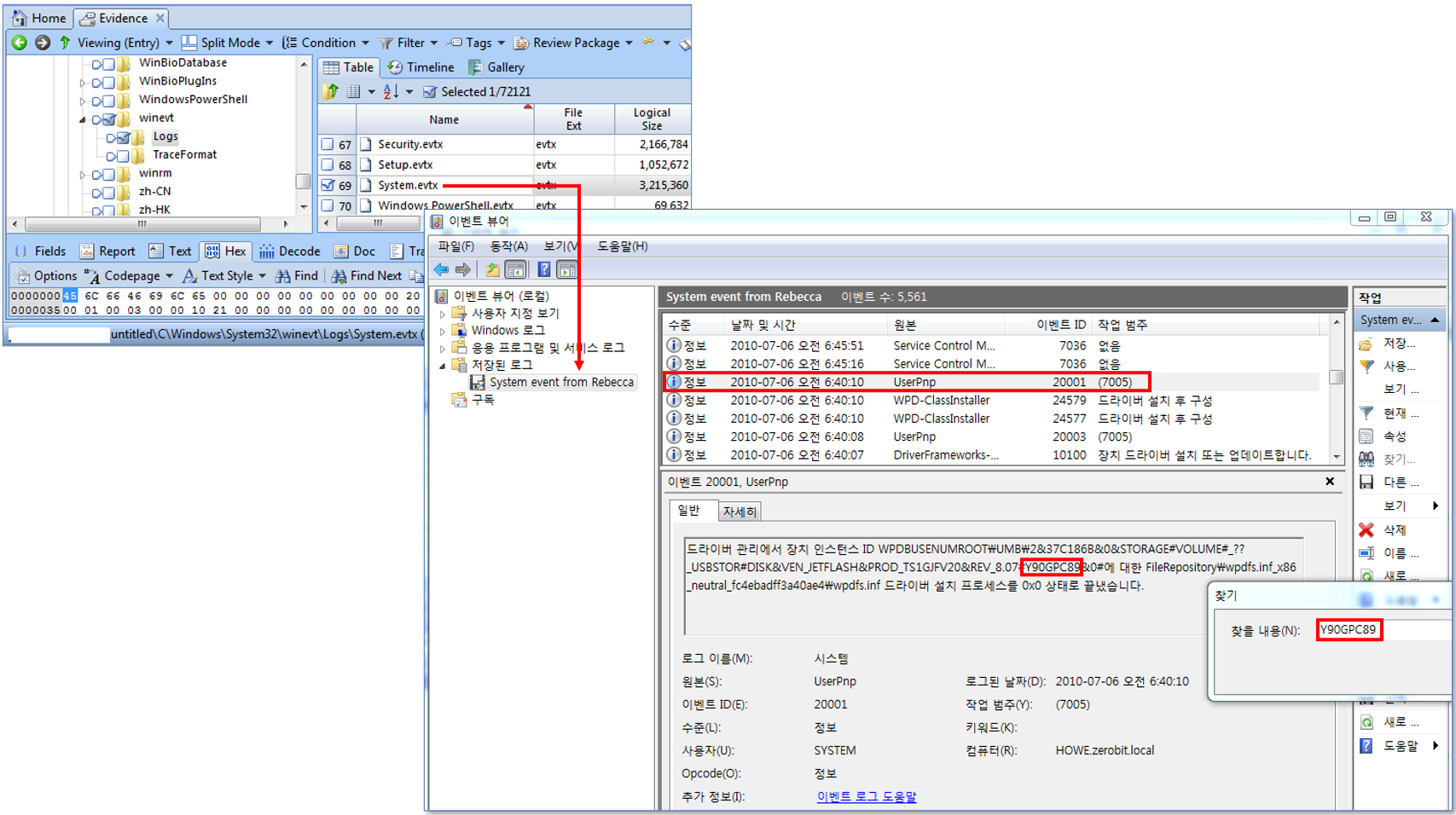 System.evtx를 내보내기 한 후, 이를 Event viewer의 ‘저장된 로그’에 들여온 후, 찾기 기능을 이용하여 iSerialNumber 값을 찾는 방법으로 조사합니다.