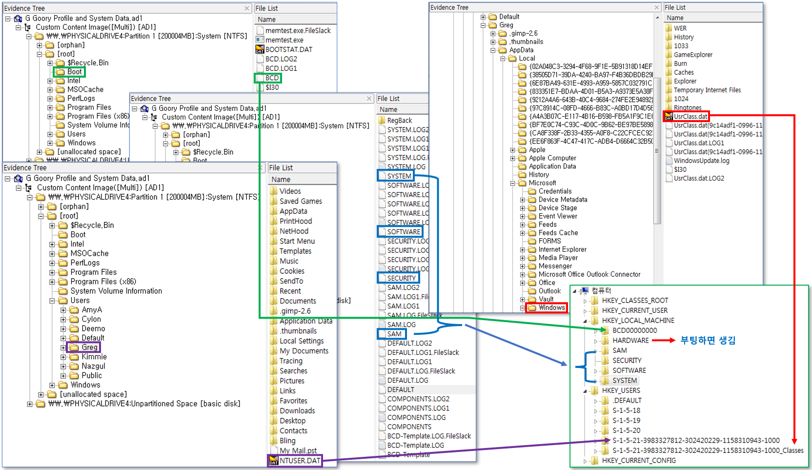 | UsrClass.dat | Secondary User Profile 입니다. User’s MUICache를 저장합니다. |