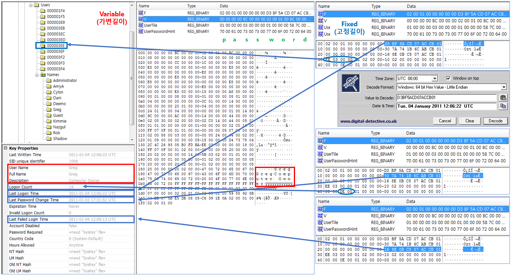 각 사용자의 RID는 Users 서브키 셋에 F값과 V값으로 기록됩니다.