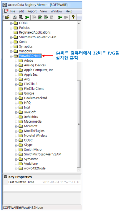 64비트 컴퓨터에서 32비트 프로그램을 설치한 흔적은 아래의 위치에 남습니다.