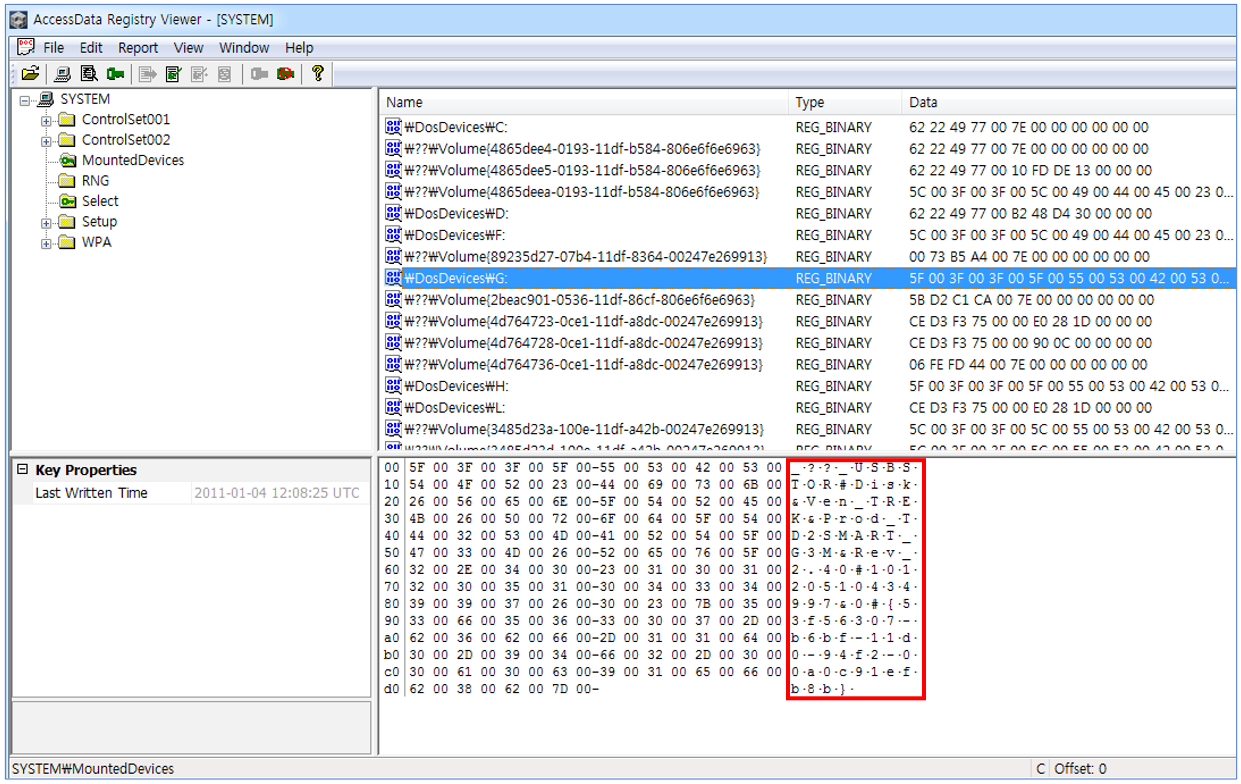 MountedDevice에서 시스템에 연결한 USB 메모리의 식별자를 포함하고, CD/DVD 기타 장치에 연결한 흔적을 확인할 수 있습니다.