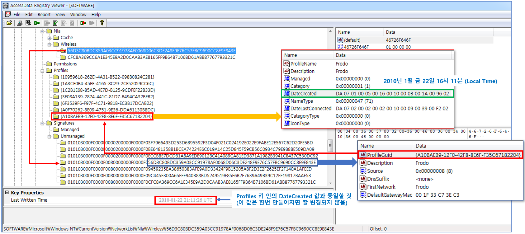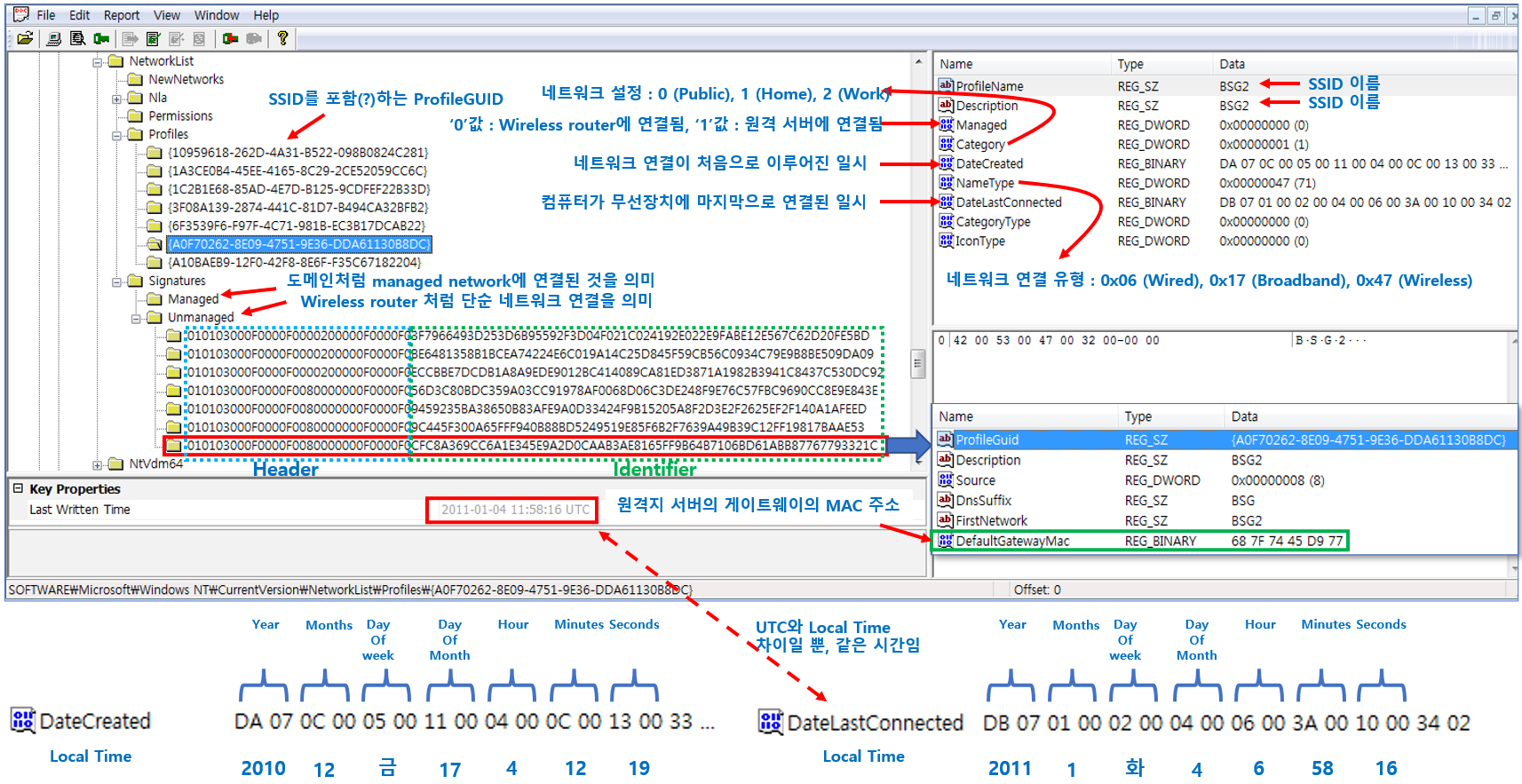 즉, ProfileGUID 서브키의 시간 정보는 무선연결이 마지막으로 이루어진 때로 보아도 무방합니다.