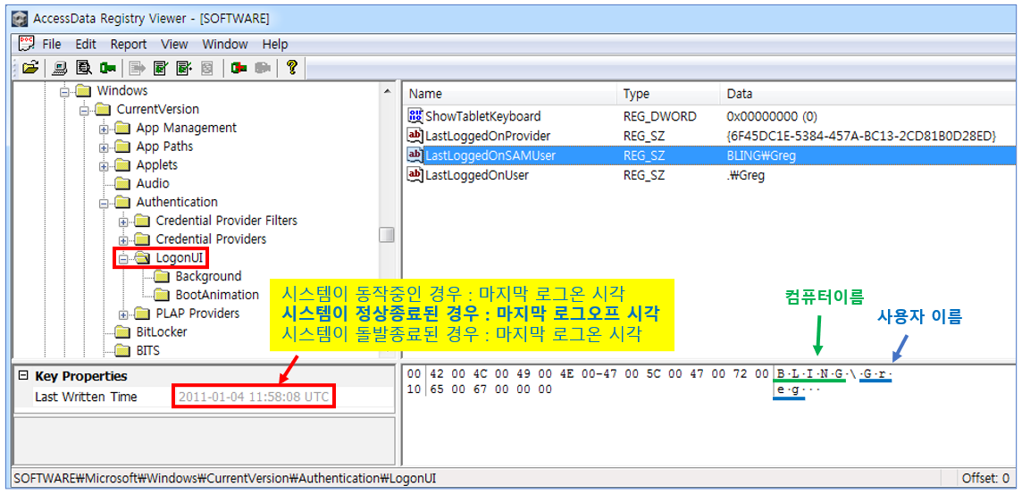 LastLoggedOnSAMUser 값에서 가장 마지막으로 로그온 한 사용자와 컴퓨터명을 확인 가능합니다.
