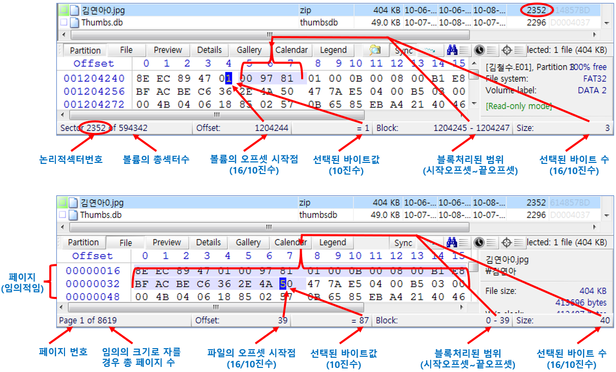 논리적 섹터 번호 / 볼륨의 총 섹터수를 표시합니다.