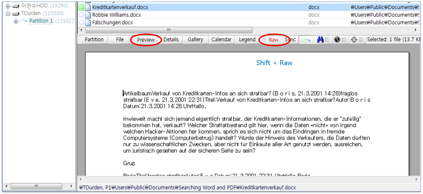 파일에서 가져온 디코딩된 텍스트를 보기 위해서는 Directory Browser에서(Search Hit List가 아님) 파일을 선택한 다음 Preview 모드로 전환해야 합니다.