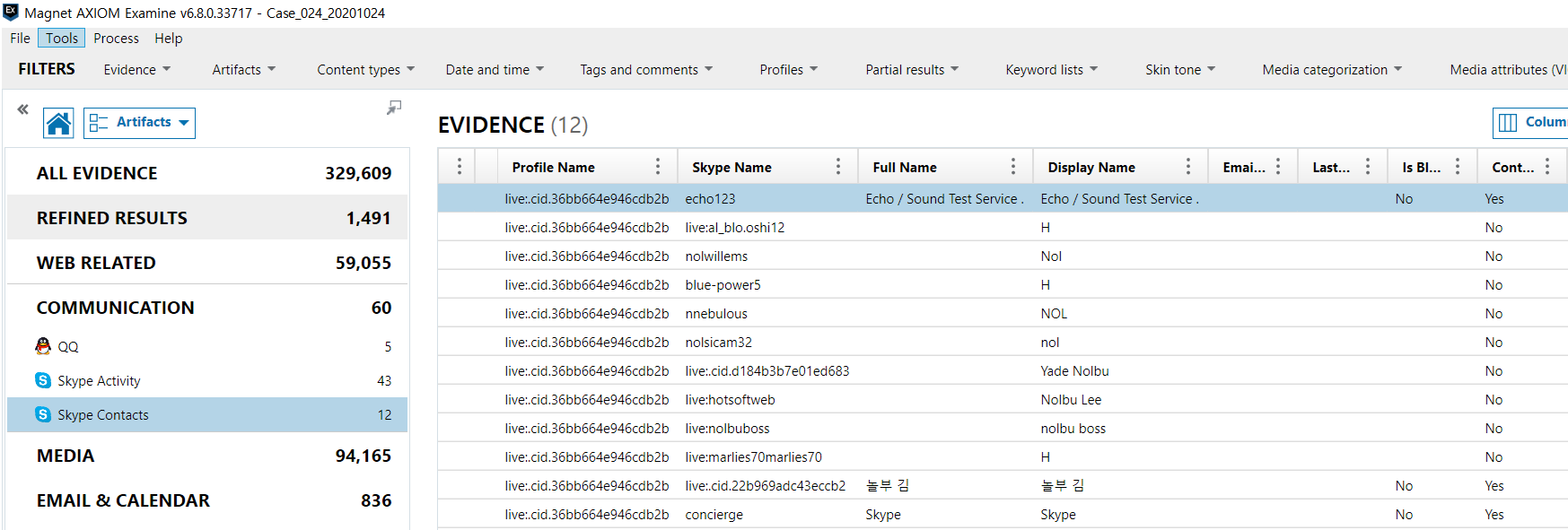 Skype 아티팩츠는 main.db 파일에서 파싱한 것입니다.