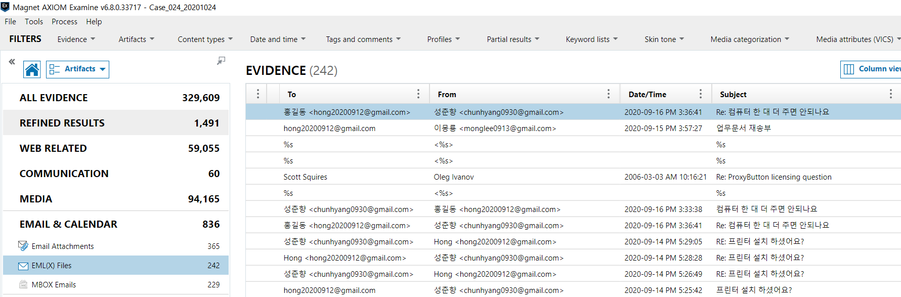 전통적인 이메일 클라이언트 아티팩츠(POP, IMAP 등) 뿐만 아니라 웹 기반 이메일에 대한 분석도 지원합니다.