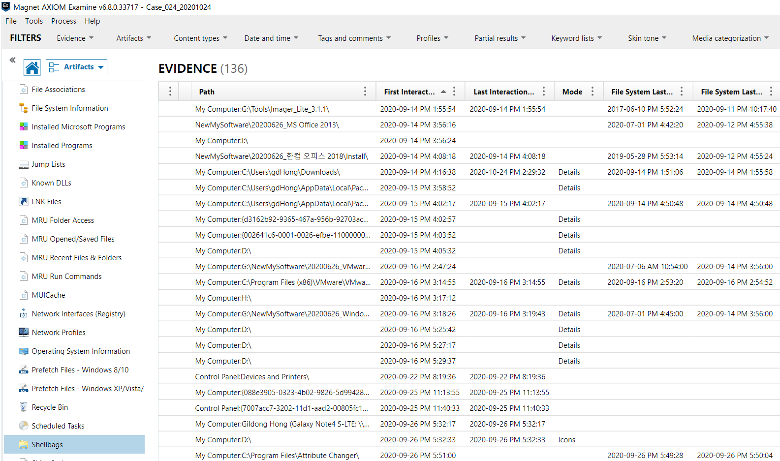 AXIOM은 윈도우 Vista, 7, 8, 10에서의 Shellbags 아티팩츠를 다음 경로의 UsrClass.dat 파일에서 파싱합니다.