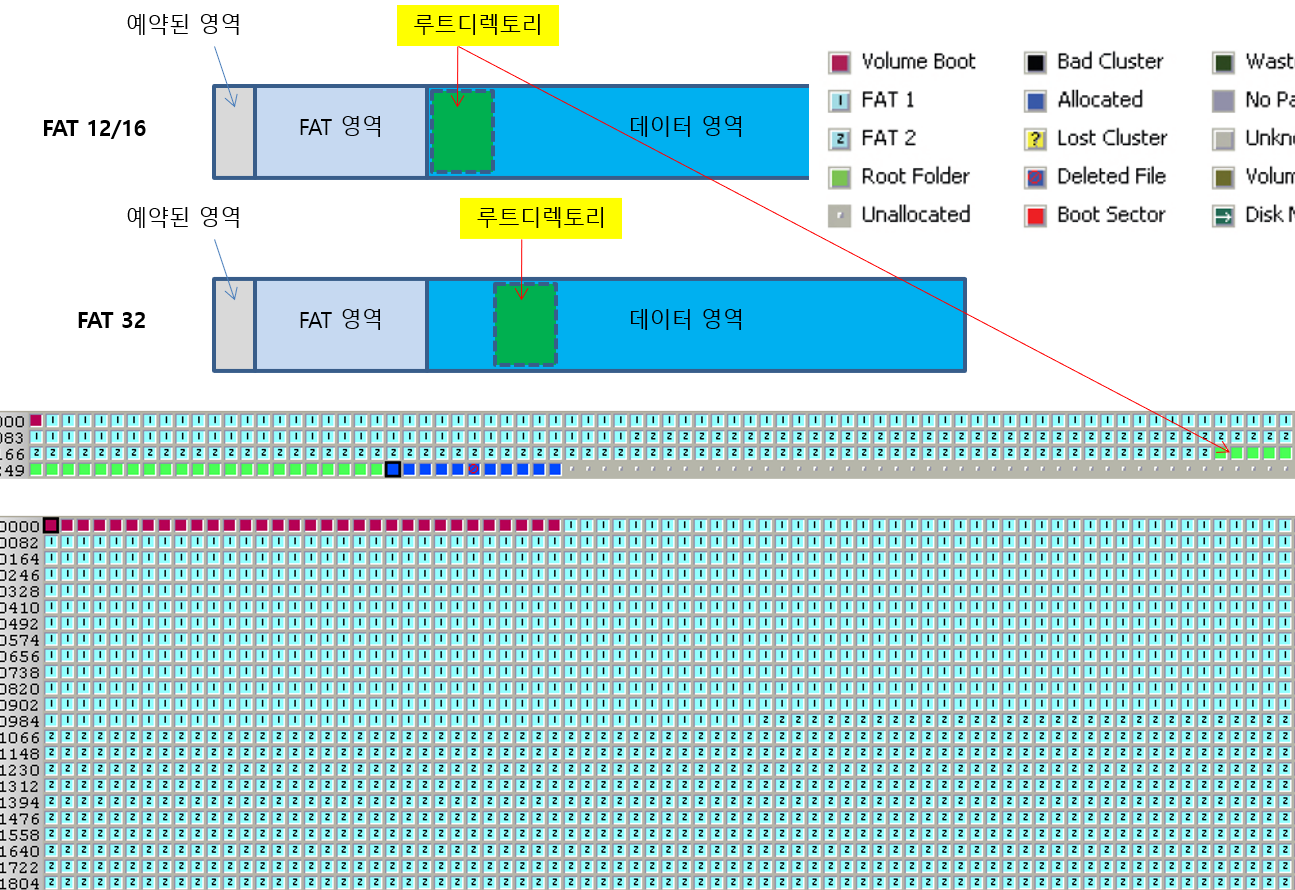 - FAT 32 : 루트 디렉토리가 데이터 영역 어느 곳이든 위치할 수 있습니다. 다만 대부분 데이터 영역 시작 부분에 위치합니다.