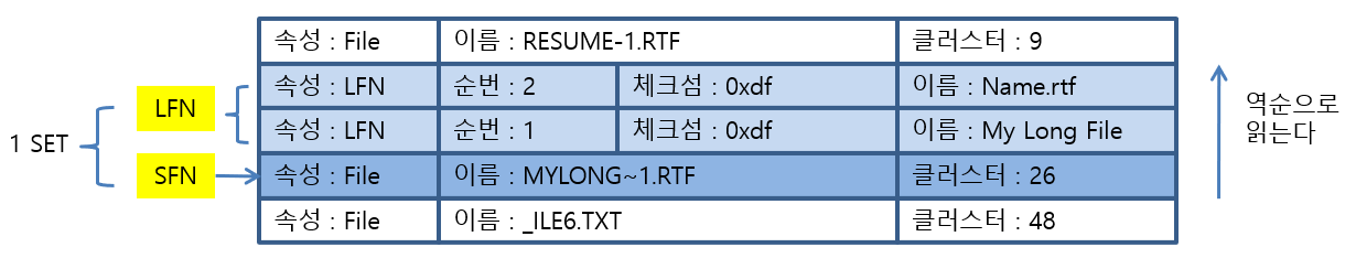 LFN 엔트리가 SFN 엔트리보다 먼저 기록됩니다.