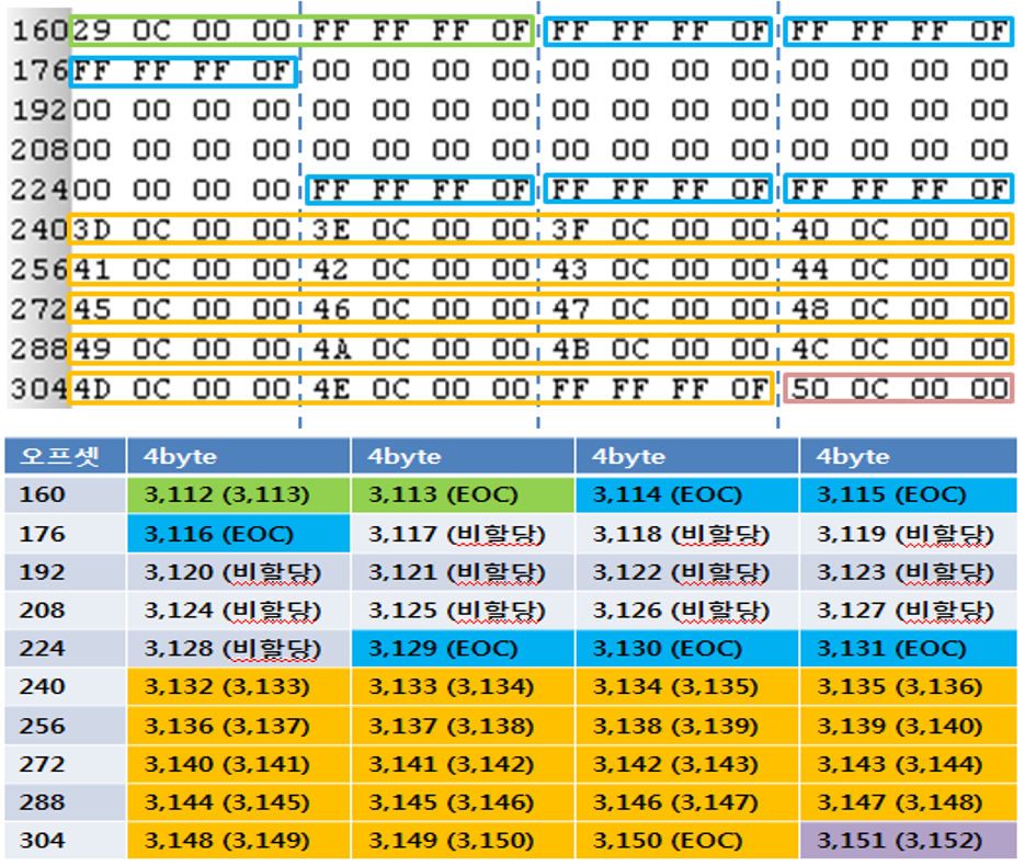 할당 클러스터중에서 파일/디렉토리의 마지막 클러스터인 경우 FAT엔트리 값은 ‘파일의 마지막’ (EOF)이라는 식별자를 기록합니다.