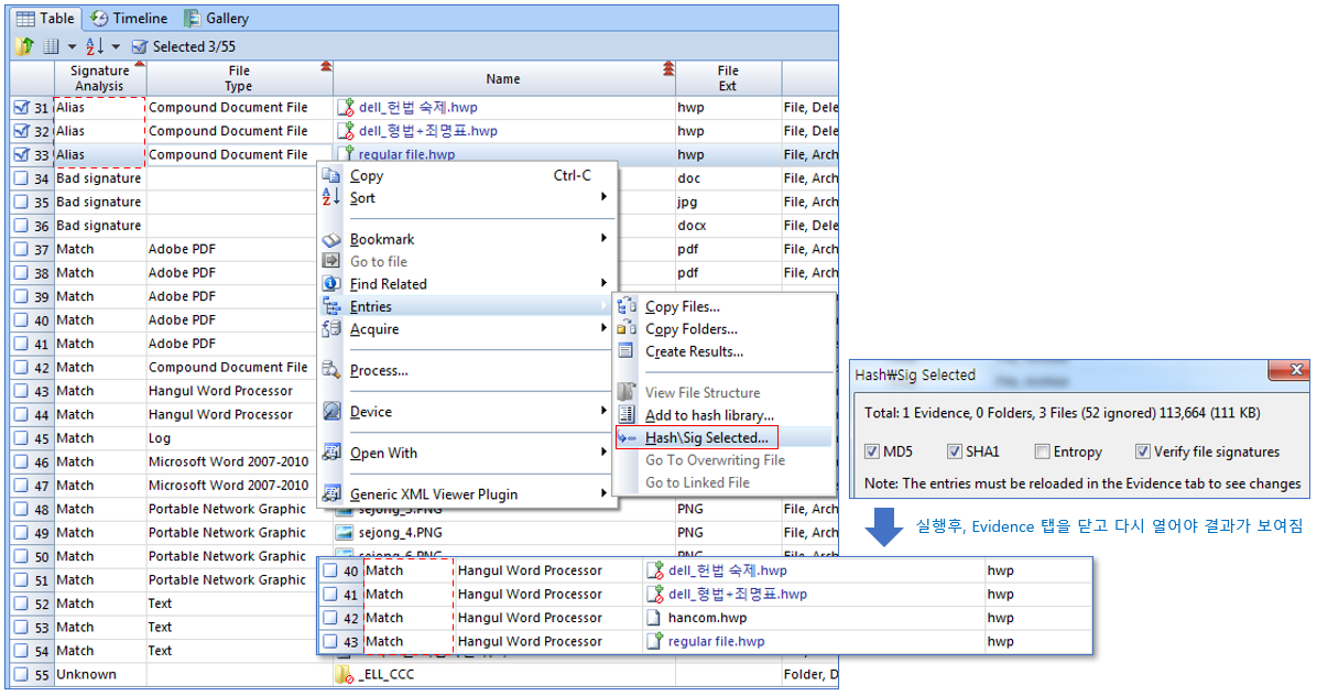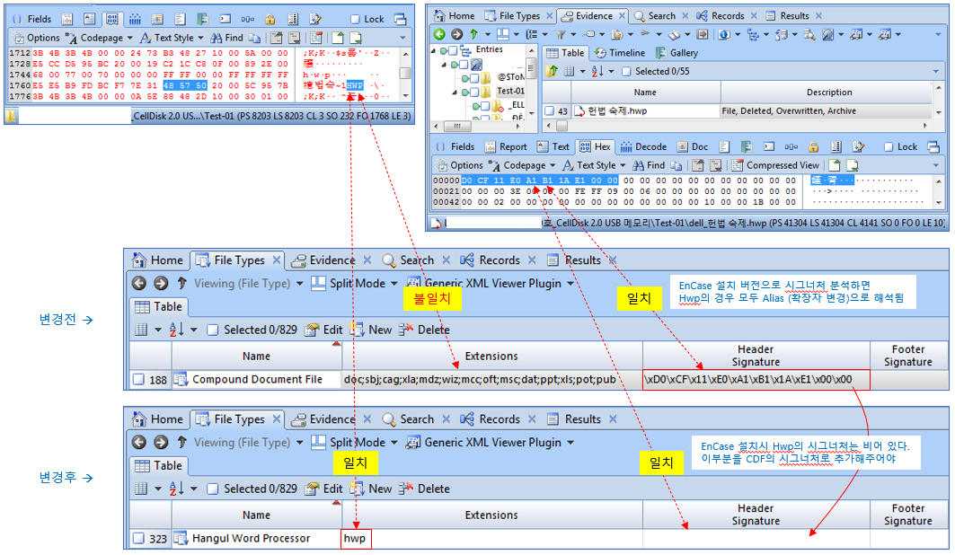 따라서, EnCase 설치 상태에서 그대로 시그너처 분석을 하게 되면, hwp는 시그너처가 CDF의 시그너처와 일치하지만, 확장자가 불일치(CDF 엔트리의 파일 확장자로 hwp가 등록되어 있지 않기 때문)하여, 그 결과 모든 아래 한글 파일이 Alias로 해석되어 모두 확장자가 변조된 것으로 잘못 분석되는 결과를 초래합니다.