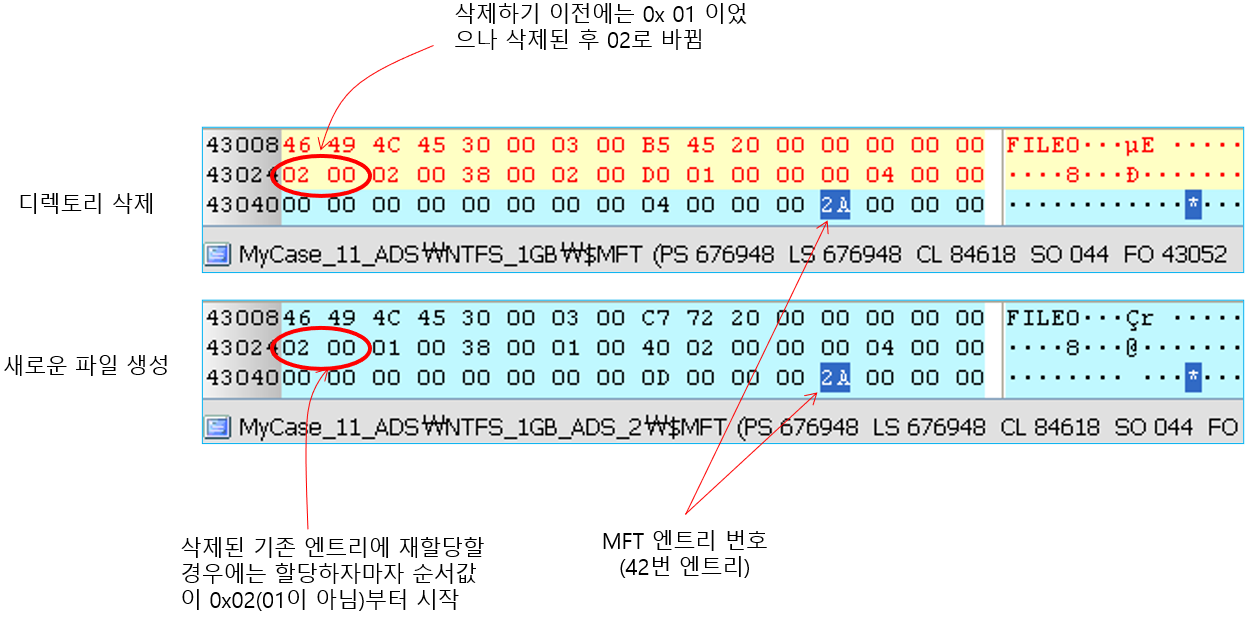 아래 그림을 보면, 디렉토리(42번 MFT 엔트리)를 삭제한 후, 새로운 파일을 생성한 결과 기존의 42번 MFT 엔트리에 그대로 덮여 쓰여진 것을 알 수 있다.