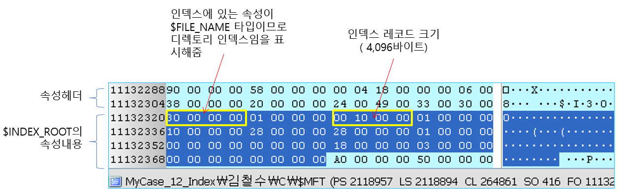 | 0~3 | 인덱스에 있는 속성 타입 (예 : 디렉토리 인덱스라면 $FILE_NAME 속성을 가지고 있으므로, 이 항목에는 0x30 이라는 값이 들어간다) |