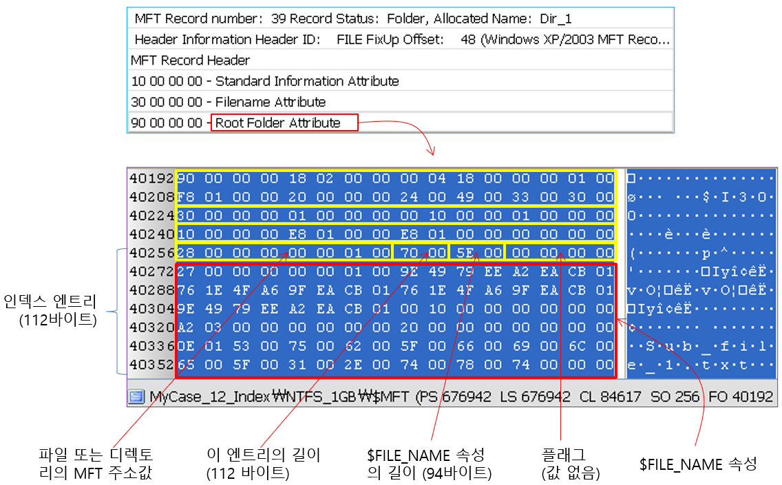 | 0~7 | 파일 이름의 MFT 파일 참조 (해당 파일 또는 디렉토리의 MFT 주소 값) |