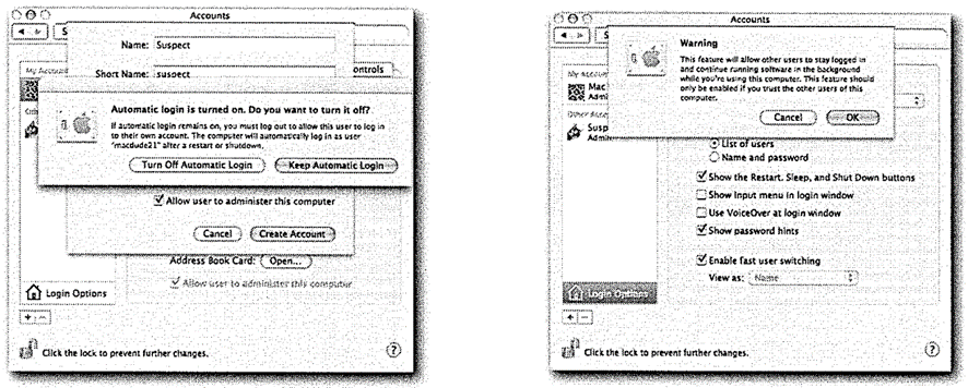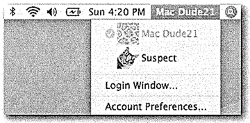 OS X는 Fast User Switching (빠른 사용자 전환)을 이용하여 한번에 여러 계정으로 동시 로그인이 가능합니다.