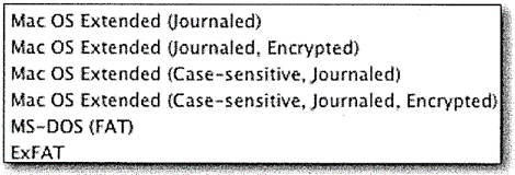 OS X에서는 파일시스템에 대해 6개의 선택사항이 있습니다.