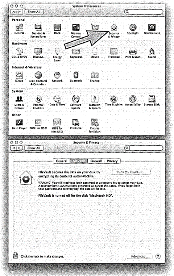 FileVault를 켜고 Master Password를 설정하는 것은 System Preferences 아래에 놓여 있던 Security application에서도 할 수 있습니다.