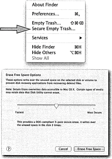 사용자가 휴지통에서 파일을 안전하게 삭제하는 것을 잊어버린 경우에는 Disk Utility의 옵션으로 Free Space 를 제거할 수 있습니다.