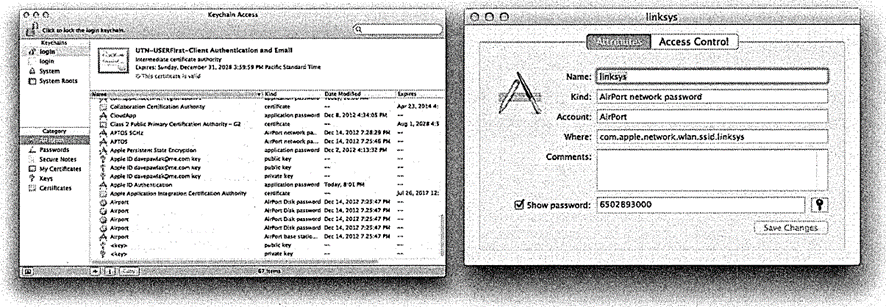 Keychain은 Utilities 디렉토리 아래에 위치한 Keychain Access 어플리케이션을 사용하는 방법으로 관리됩니다.