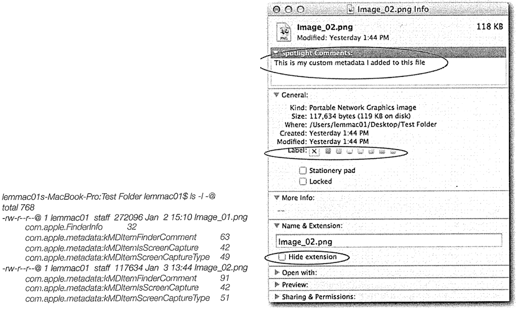 Tiger (2005, v10.4)버전 이래로, OS X는 확장 파일 속성(extended file attributes)을 사용하여 파일에 대한 추가적인 메타데이터를 저장합니다. 이러한 메타데이터는 HFS+ 파일시스템 Attributes File 안에 위치하게 됩니다.