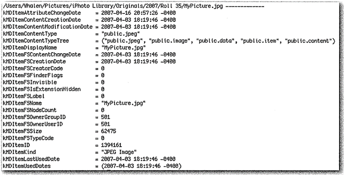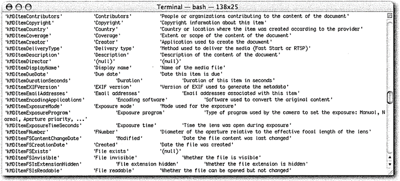 이용 가능한 속성의 목록은 mdimport 명령어를 사용하여 확인할 수 있습니다.