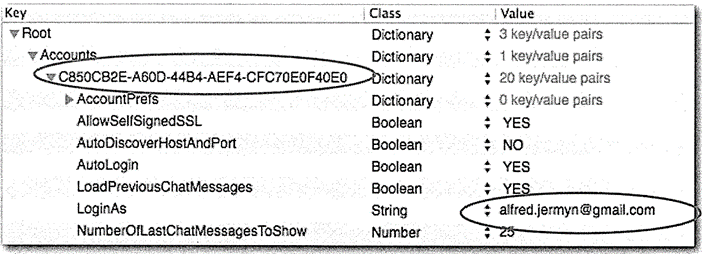 jabber plist 파일은 관련된 Gmail account에 대한 상세한 사항을 보여줍니다.