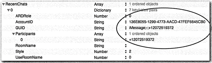 GUID 가 chat.db 파일 아래에서 발견될 수 있고 사용자가 다른 메시지 대화를 위해 사용한 계정을 식별할 수 있습니다.
