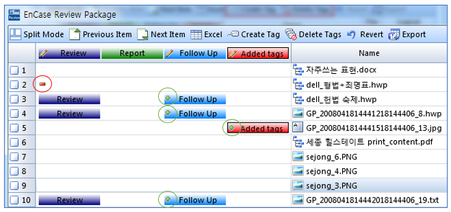 검토자가 포렌식 분석관의 태그를 사용하거나 제거하게 되면 +, - 표시가 붙습니다.