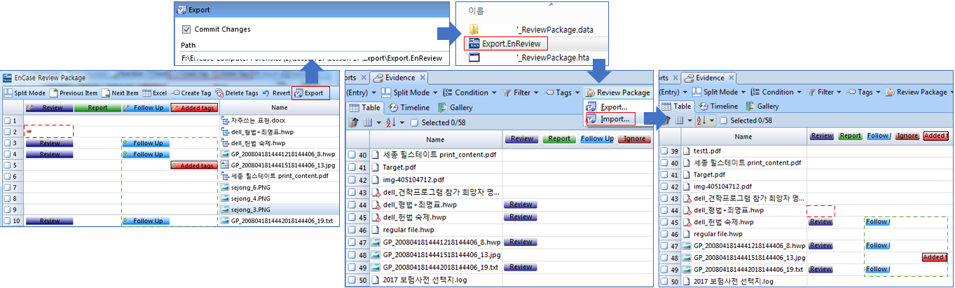 검토자가 .EnReview 파일(검토 결과물)을 만들어 포렌식 분석관에게 회신하면, 포렌식 분석관은 검토 결과물을 다시 EnCase로 들여오기 하여 재분석 가능합니다.