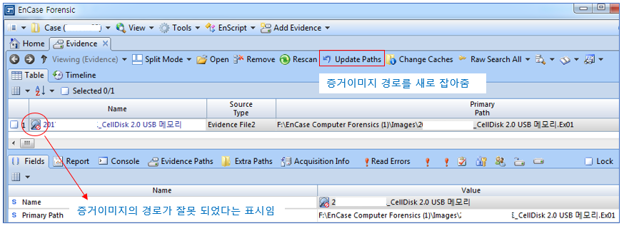 증거이미지 파일의 경로가 잘못 되어 있으면, [Update Paths]를 이용하여 새로 잡아 주면 됩니다.