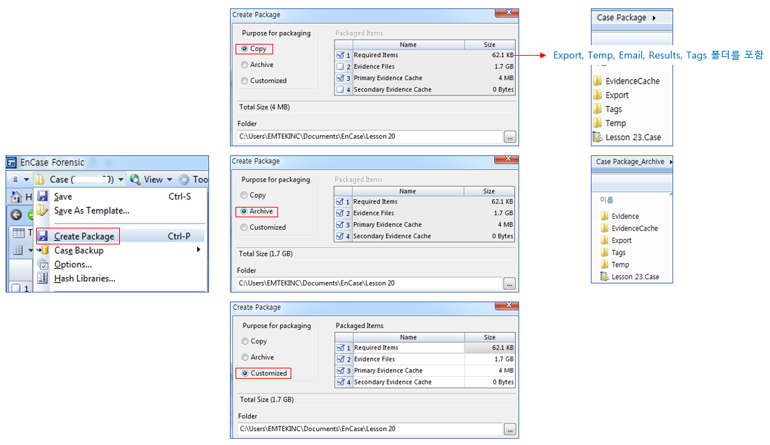 EnCase V7 이후에서는 케이스 파일, 케이스 폴더, 증거 캐시의 백업 파일에 대한 백업을 다음과 같이 패키지로 만들 수 있습니다.