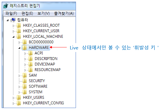 ‘HARDWARE’ 키는 Live 상태에서 REGEDIT를 통해서만 볼 수 있으며, 여기에는 부팅 과정에서 탐지된 하드웨어 장치에 대한 정보를 포함합니다.