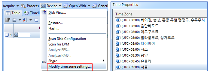 만약 A 라는 타임존에서 컴퓨터를 획득한 후, B라는 타임존으로 보내어 분석을 하게 된다면 B 타임존의 분석관은 EnCase에서 타임존을 A 타임존으로 맞추어 분석해야 합니다.